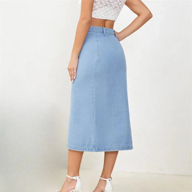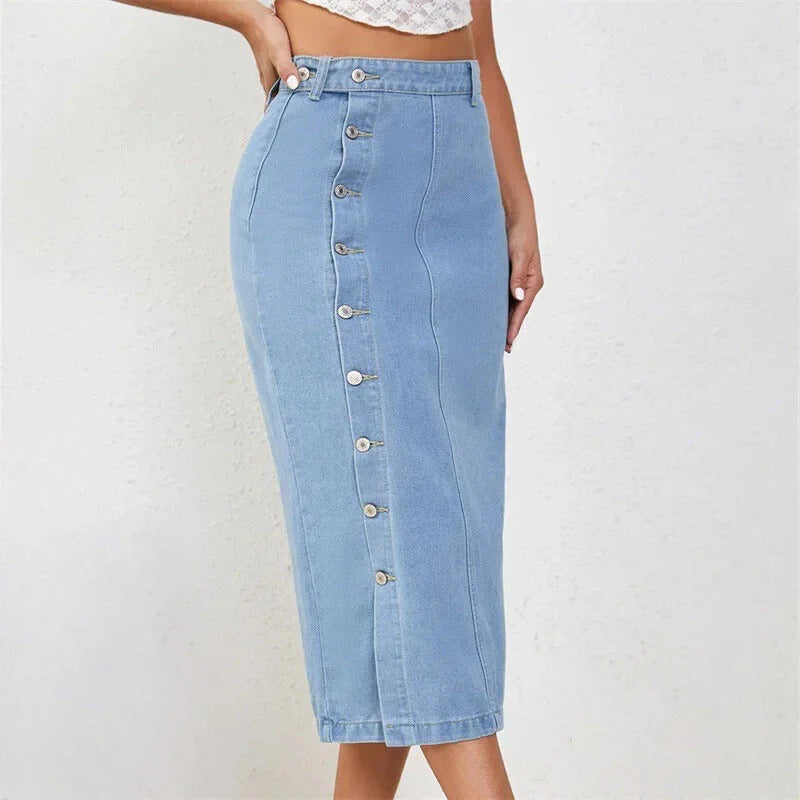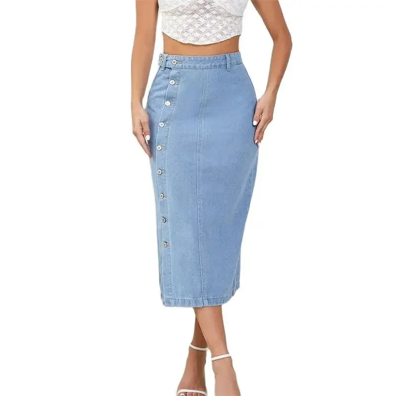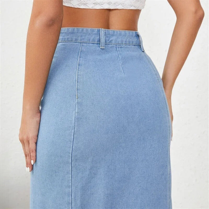 Made from soft, breathable denim, this skirt hugs your curves in all the right places without restricting your moves. Perfect for dancing, walking, or just lounging around. The light blue wash and trendy button-up design make this skirt a standout piece. Pair it with your favorite crop top or a breezy blouse, and you’re ready for any summer adventure!